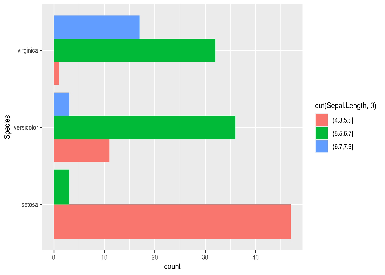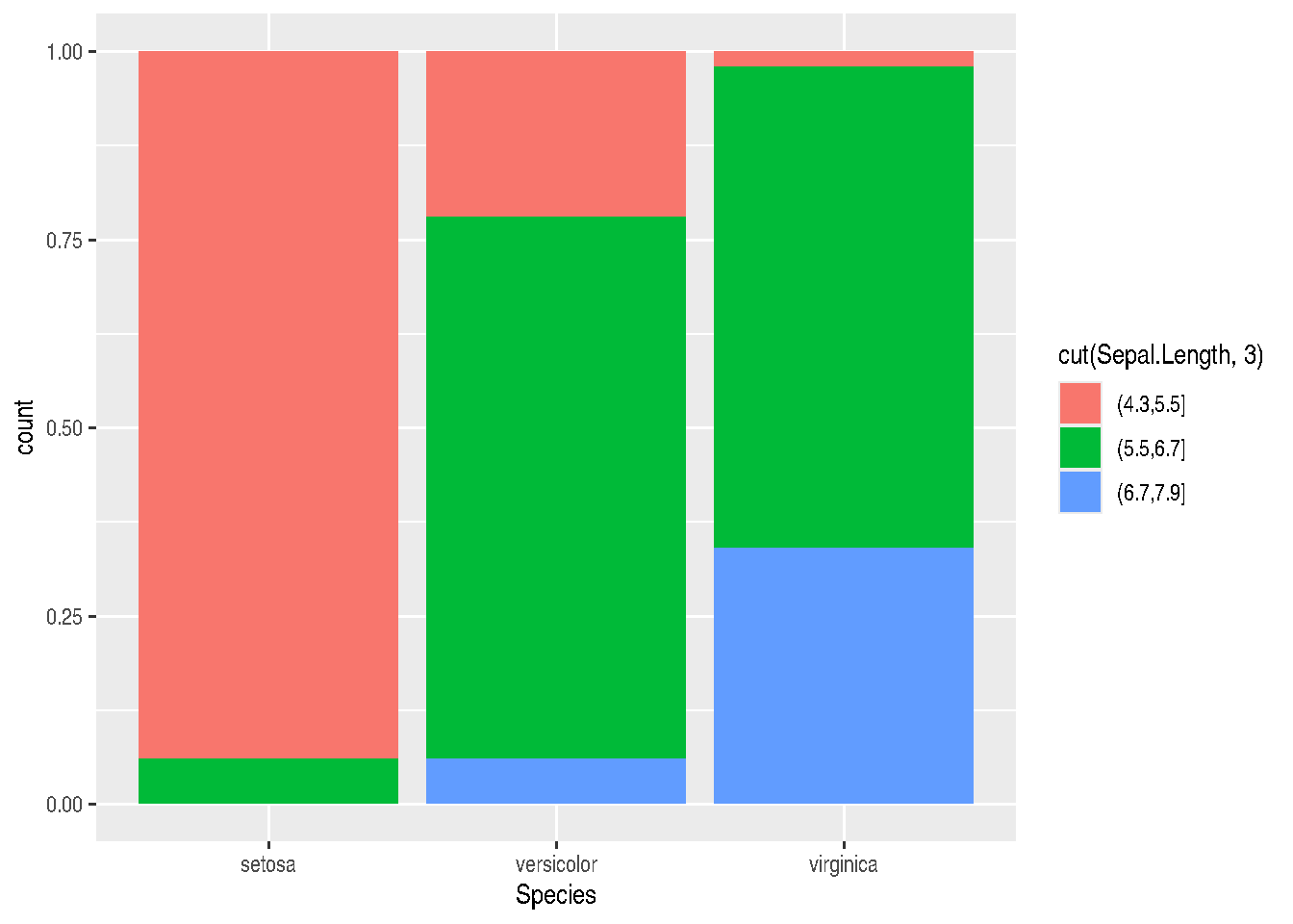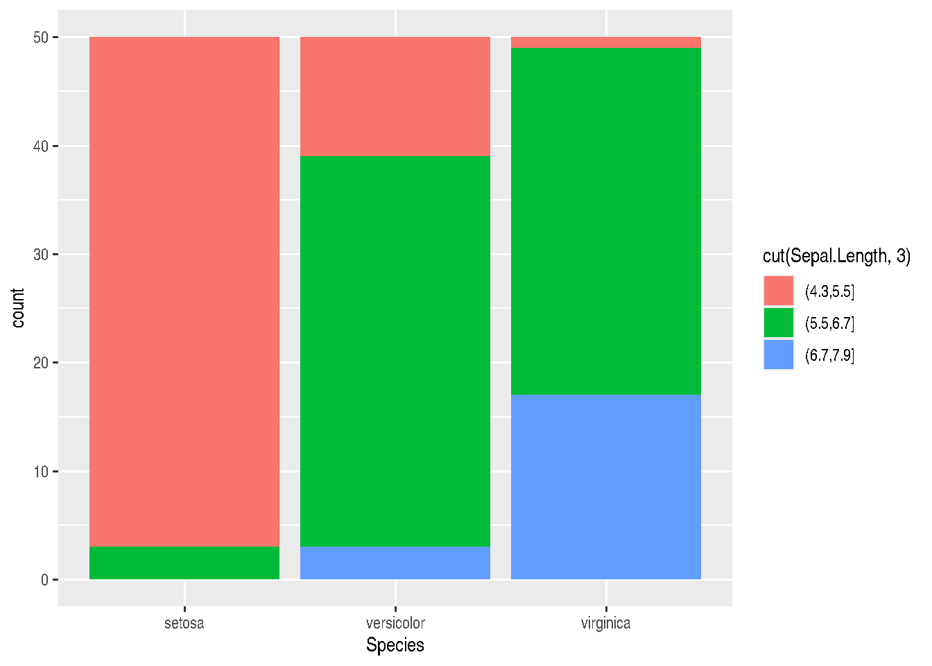 ggplot(mapping=aes(x=Species, fill=cut(Sepal.Length, 3))) +