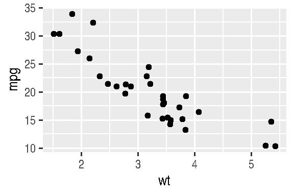 geom_point(mapping=aes(x=wt, y=mpg)) +