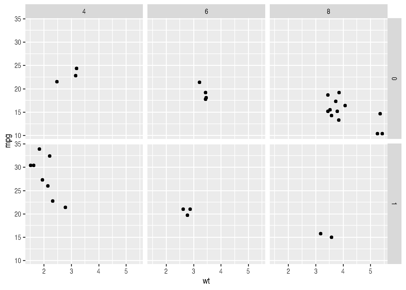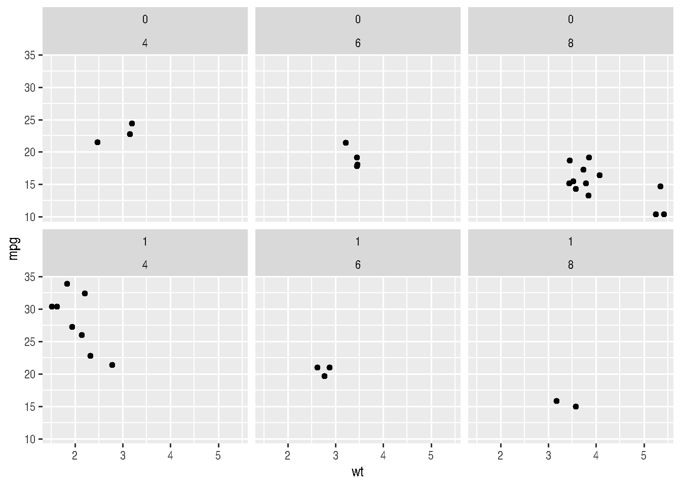 In the case of facet_grid(), the organization of output will be a bit different. A grid will be made, as the function name itself says, where rows will concern one of the variables and column the other variable. It’s like a matrix of small graphs.