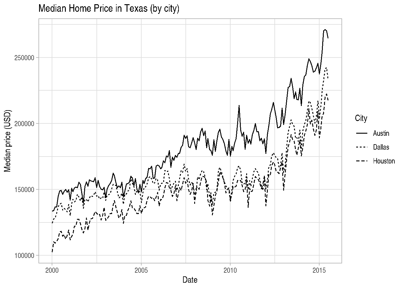 ggplot(tx_subset, aes(x = date, y = median, linetype = city)) +