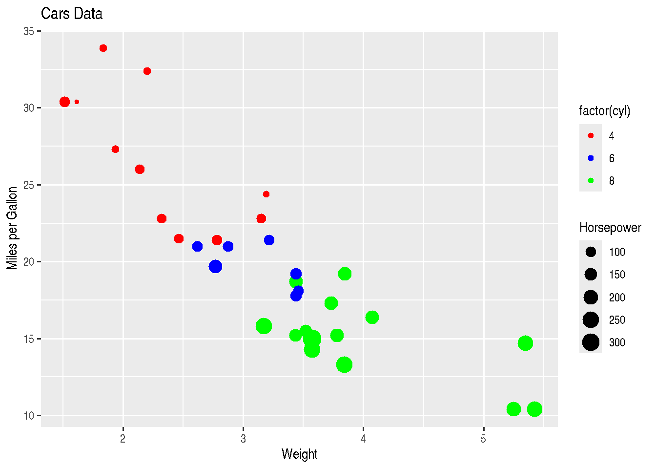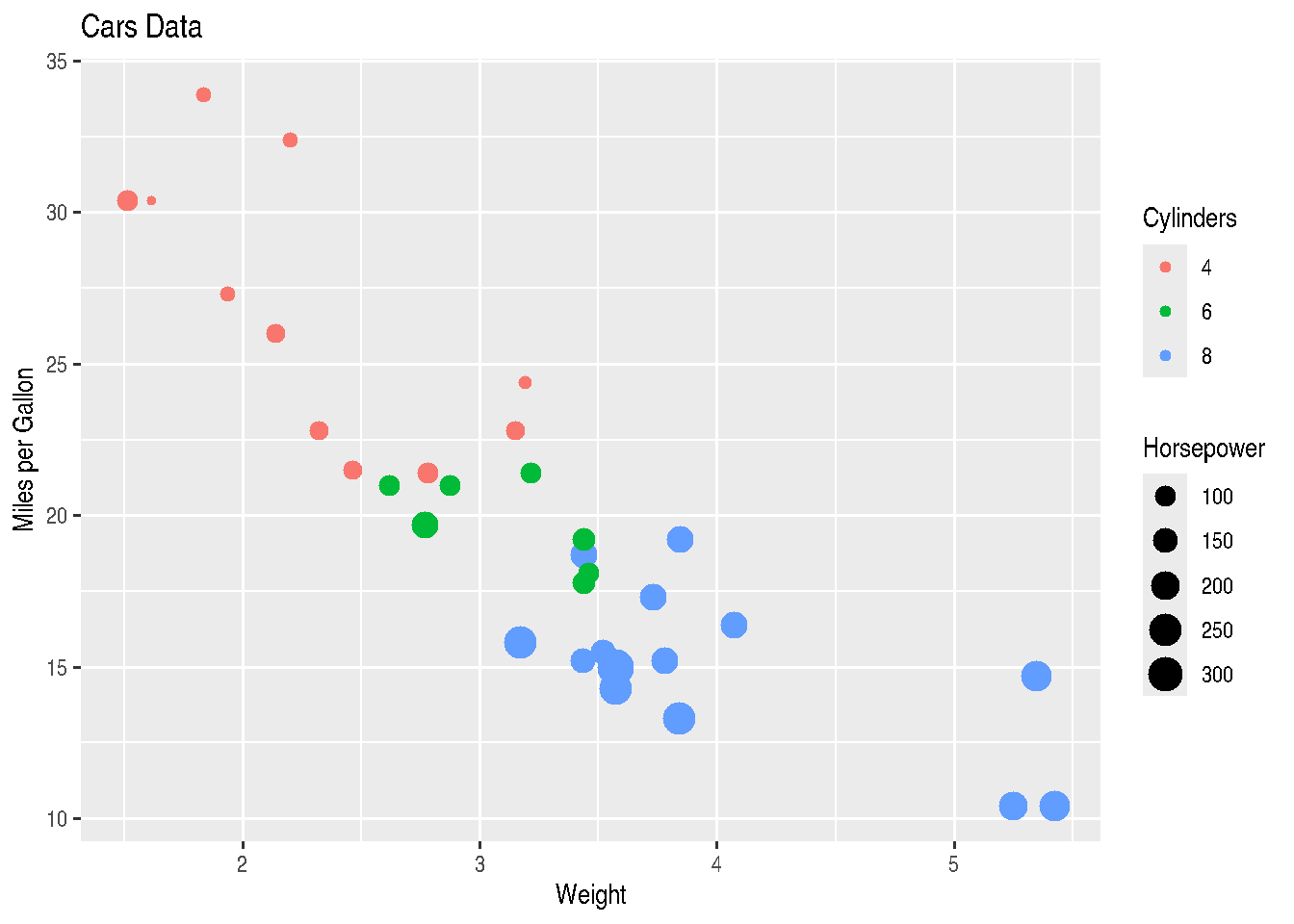 We can even have more than one mapping argument inside aes() and we can control legends of each one, adding one more layer to the graph: