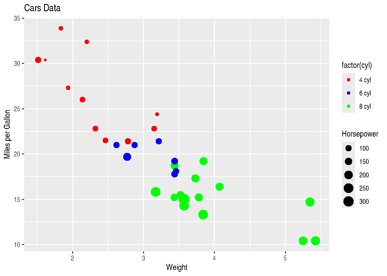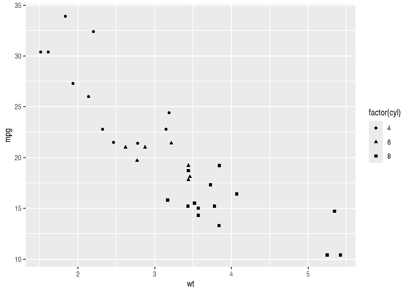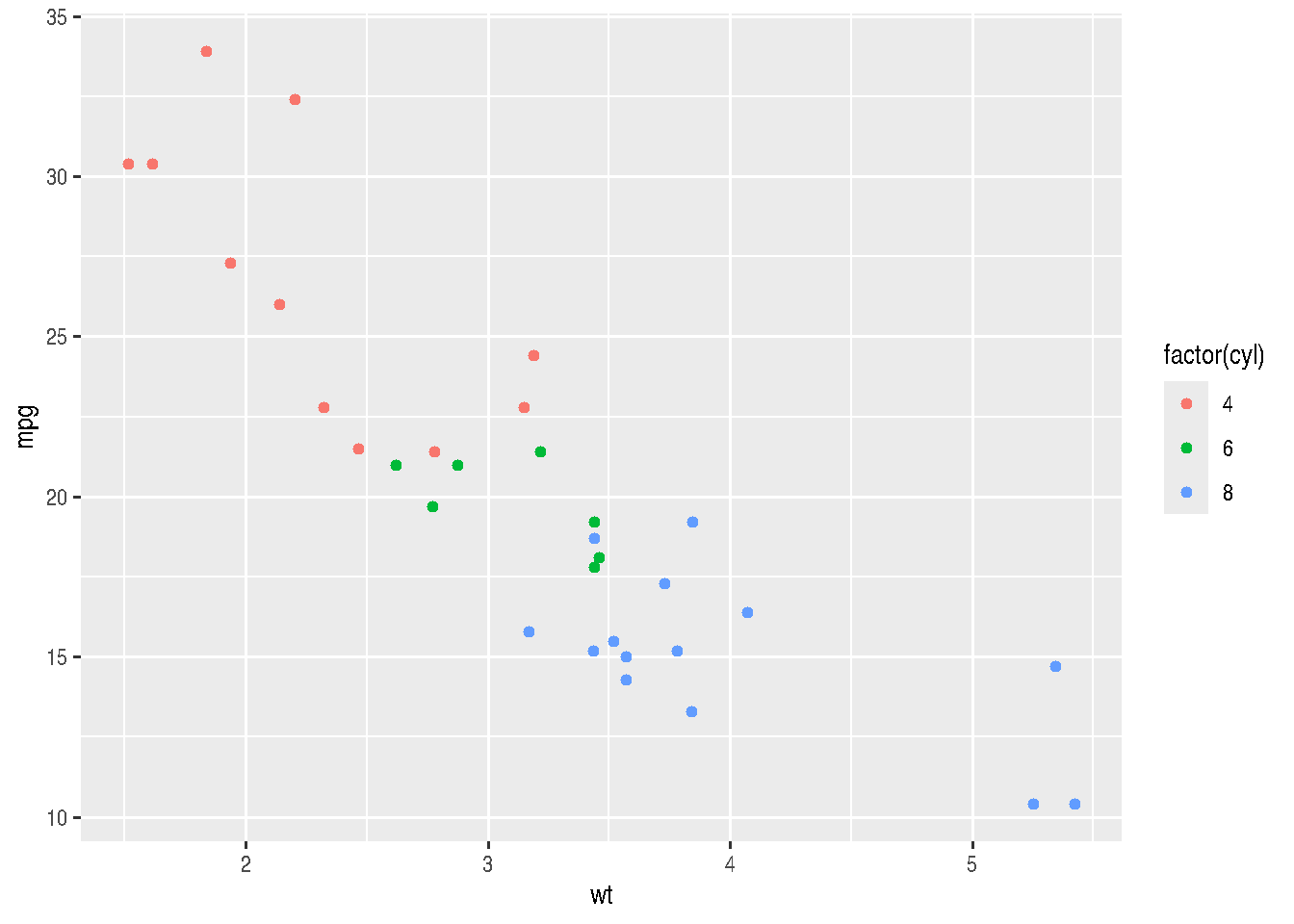 # geom_point(mapping=aes(x=wt, y=mpg, colour=factor(cyl))) +